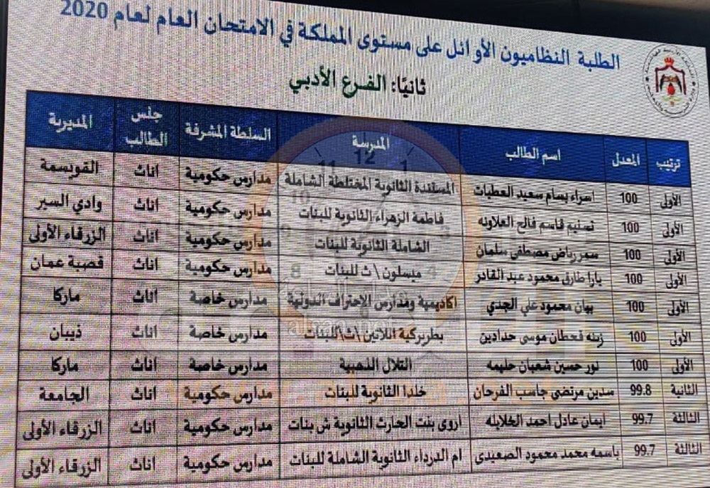 الأردن اسماء العشر الأوائل في الثانوية العامة توجيهي 2020 شاهد